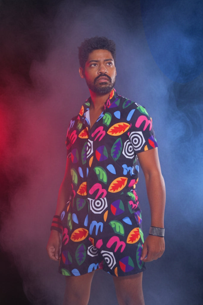 This romper offers a playful Halloween costume option or a charming nod to 80s fashion. Designed with a unisex fit based on men's sizing, women are advised to size down for the best fit.