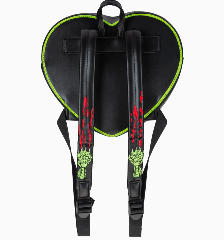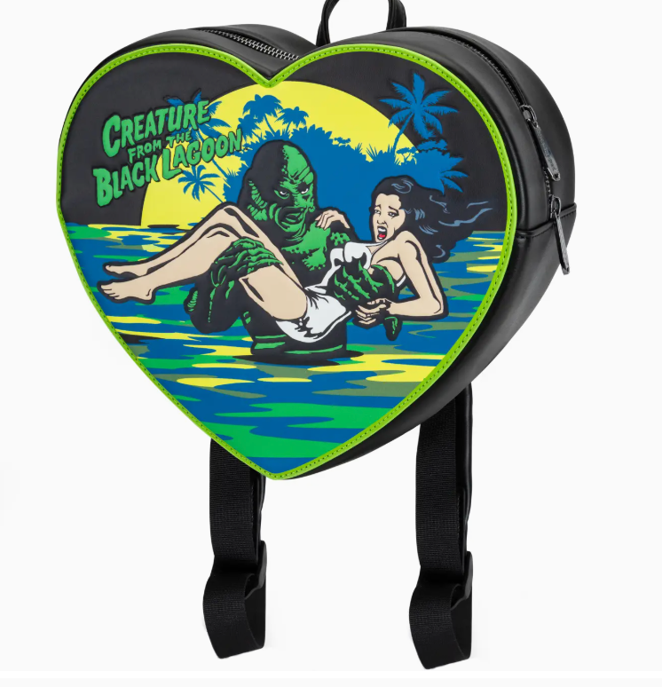 Celebrate the legacy of Creature from the Black Lagoon with this officially licensed heart-shaped backpack. Featuring embossed and embroidered artwork of the Creature and his iconic damsel, along with custom embroidered straps, this piece is a bold tribute to one of Universal’s most legendary monsters. Features: * High Quality Vegan PU Leather * Padded, Adjustable Straps With Embroidered Details * Custom Glow in the Dark Zipper With Gunmetal-Colored Hardware * Green Satin Lining * Inside Pocket Dimensions: * L 10" x W 11" x H 4"